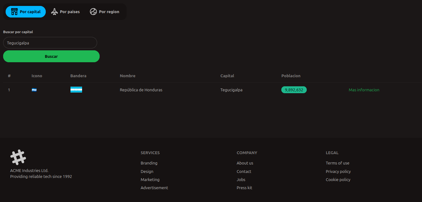 Proyecto para buscar paises mediante la capital, el nombre del pais o recuperar todos los paises de una region. Brinda informacion basica del pais en una tabla y tambien una pagina de informacion detallada de ese mismo pais. La informacion de los paises se recupera de la API de RestCountries